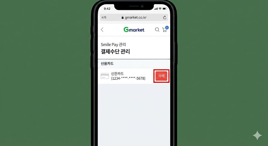 - 경로: G마켓 앱 하단 사람 아이콘(마이페이지) > Smile Pay > 결제수단 관리